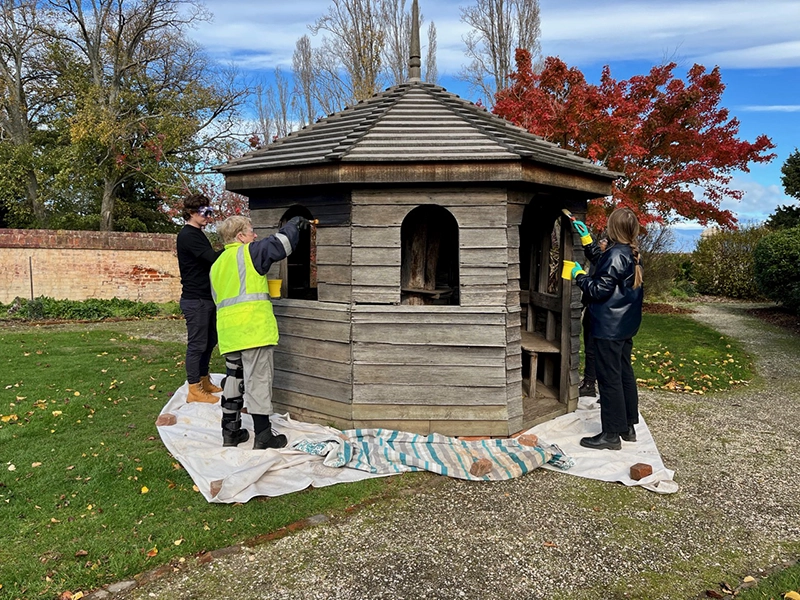 Participants applying linseed oil to Woolmers summer house